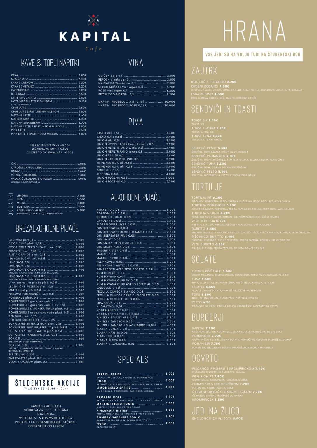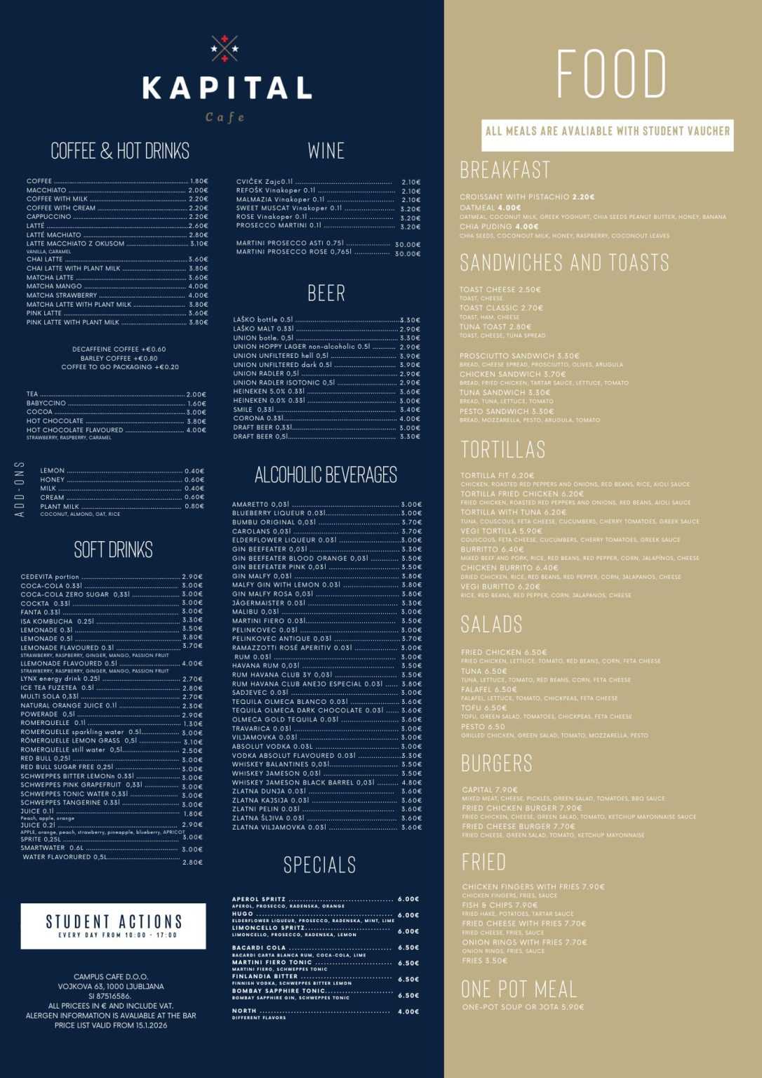 Kapital Cafe je več kot samo lokal na Kardeljevi ploščadi. Nahaja se v zaledju dreves parka med Fakulteto za upravo in Ekonomsko fakulteto ter predstavlja miren kotiček za vse, ki si v dnevu zaželite kanček ležernosti in umirjenosti. Za vas smo odprti od ponedeljka do petka, med vikendom pa nudimo najem prostora za razne dogodke, tako poslovne kot zasebne narave.